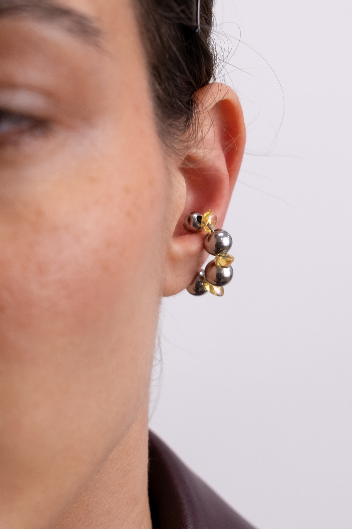 Earcuff en acier inoxydable. Il s’agit d’un faux piercing pour oreille non perçée qui se positionne au niveau du conch ou du lobe suivant la largeur de l’oreille. Il est composé d’un anneau argenté, avec des perles en verre de trois variantes de couleur et argentées.